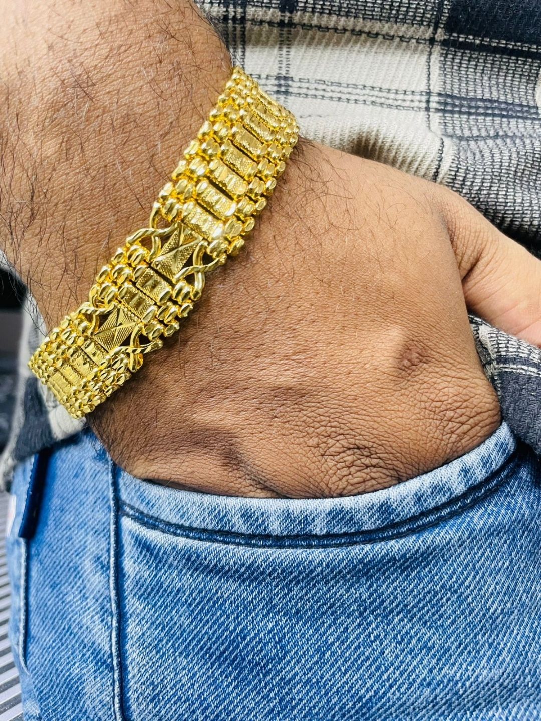 This micro gold plated bracelet features a sleek solid band style, accented with subtle grooves or ridges that resemble the lines of a rising sun on the horizon. Its minimal yet masculine silhouette makes it perfect for those who like clean, bold wristwear with quiet luxury.