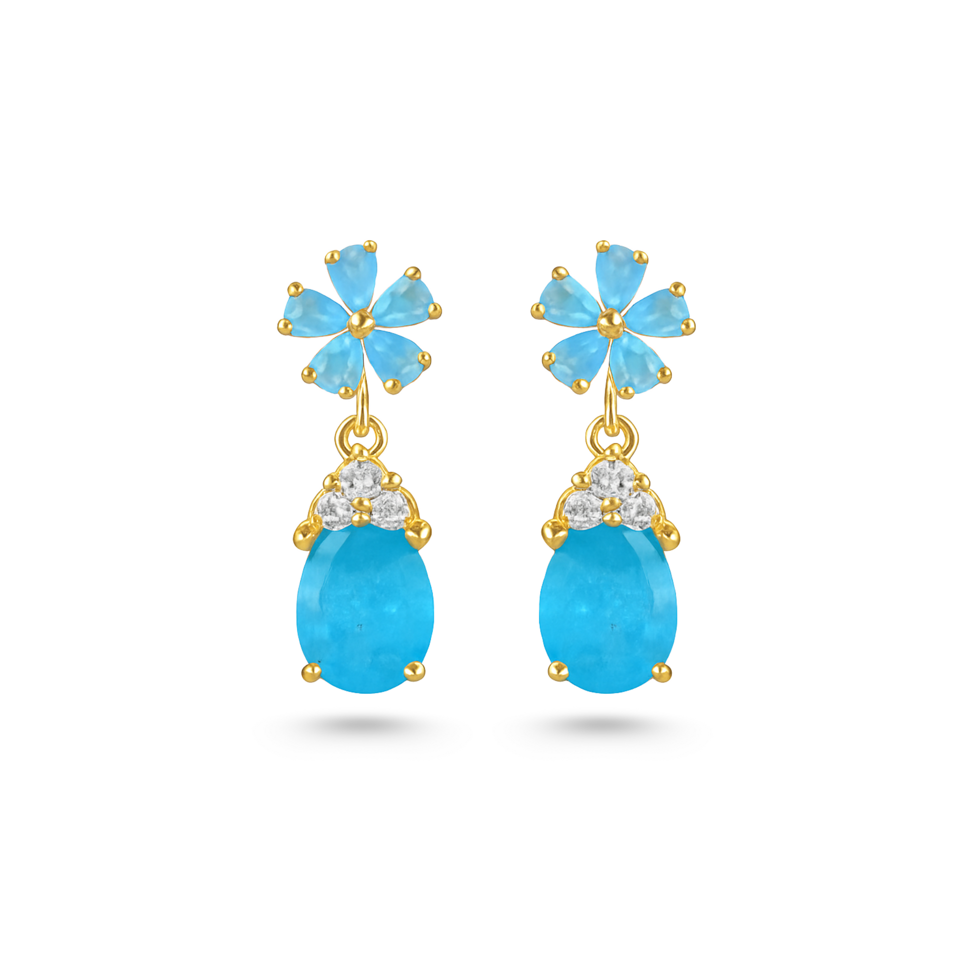 This beautiful pair features a delicate floral-inspired design with a striking sky blue stone as the centrepiece.