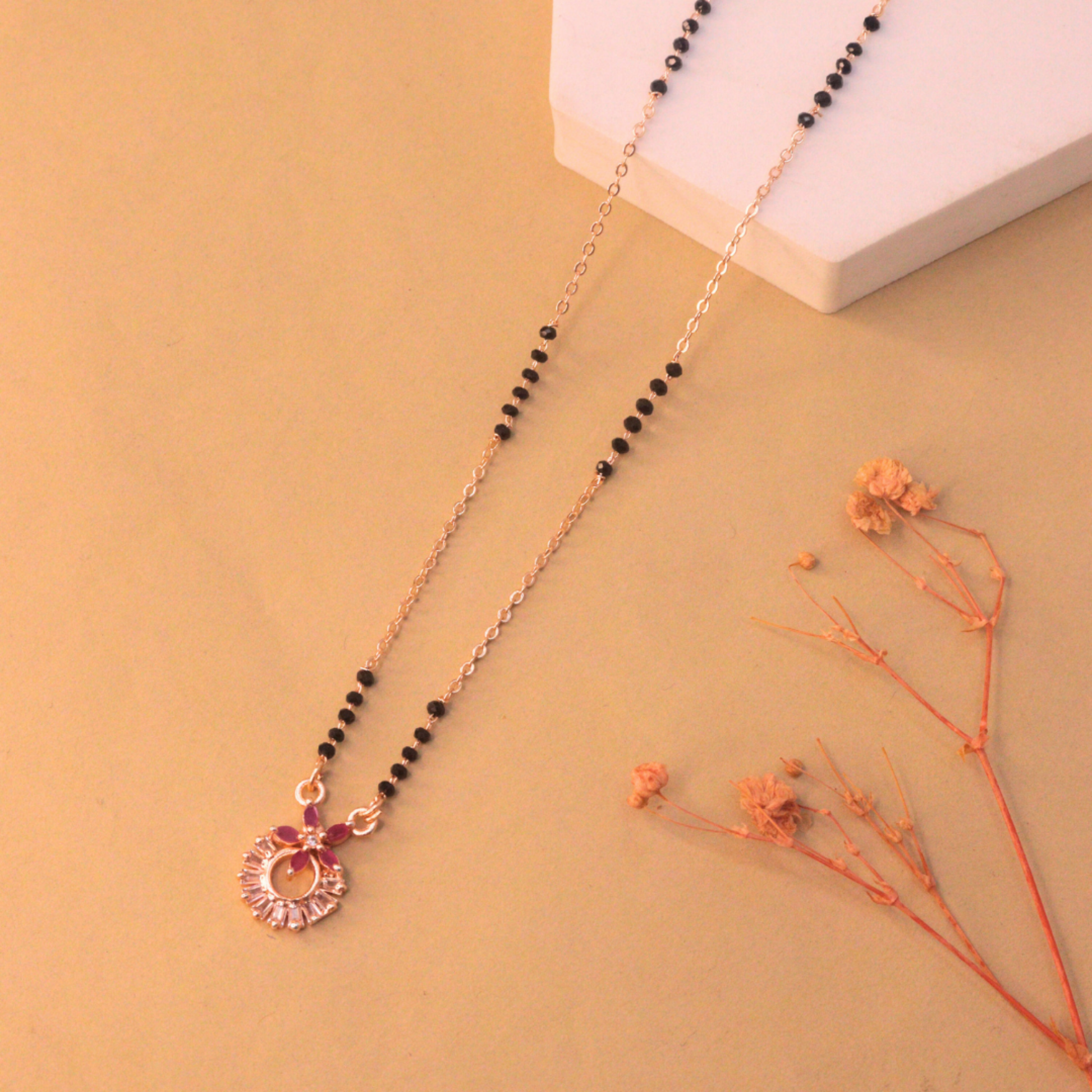 Crafted in 925 sterling silver and finished with luxurious rose gold plating, the Esha Mangalsutra features a delicate, minimalist pendant set on a traditional black beaded chain.
