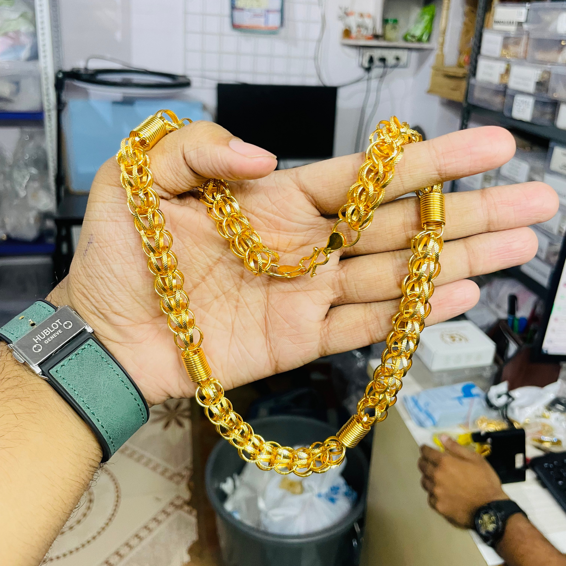 Wear this chain solo over a black or white tee for a clean, standout look — or layer it with another gold piece for extra edge.