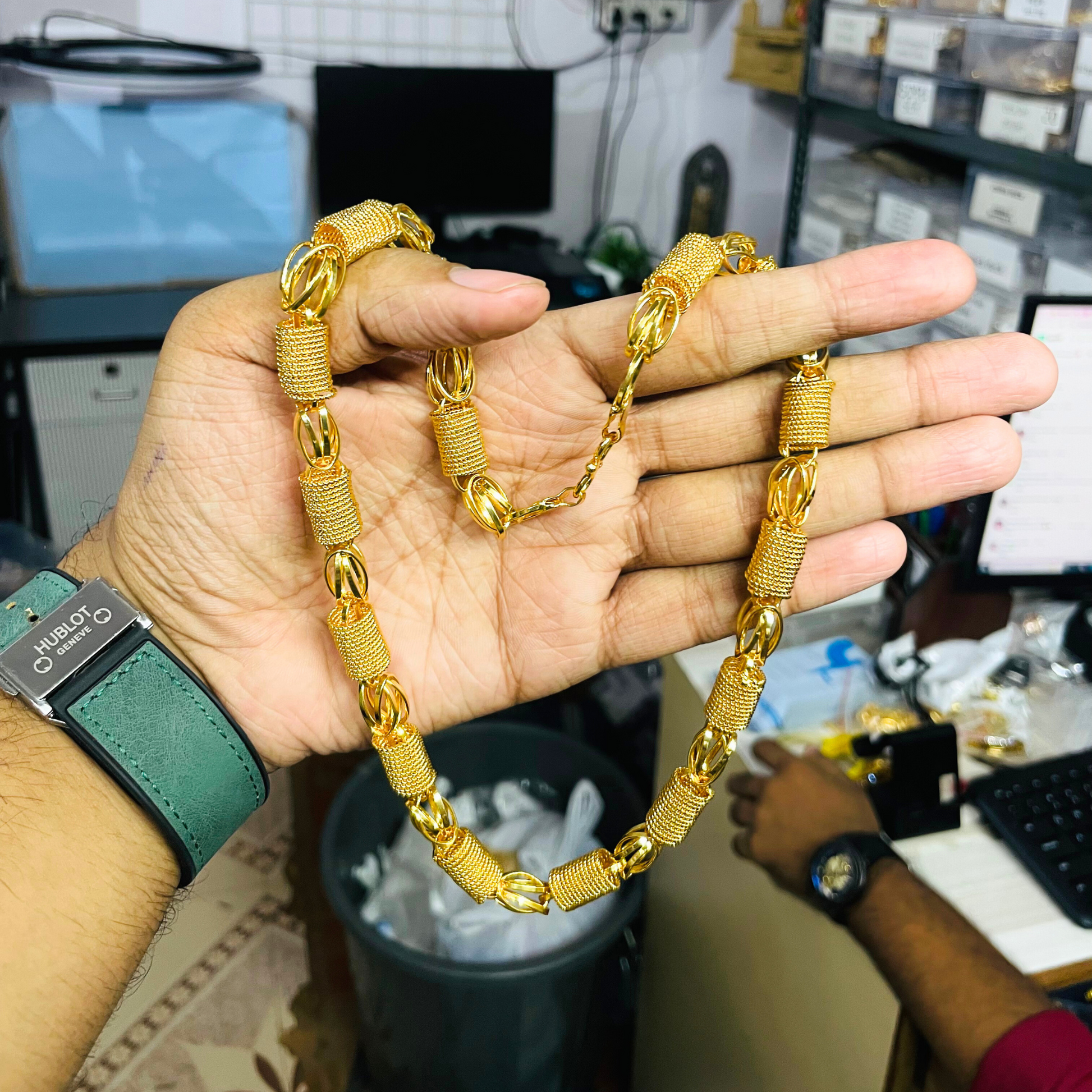 With bold, symmetrical links and a striking finish, this chain is crafted in premium Brass with micro Gold Plating, giving it a rich, high-shine appearance. Its commanding presence and refined build make it a standout piece for any occasion.