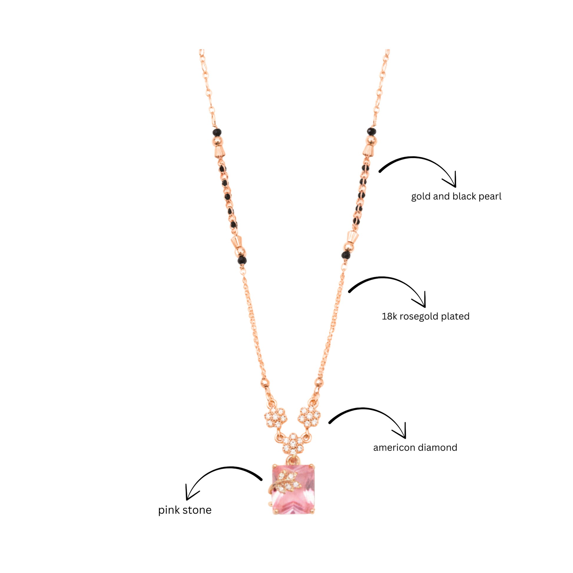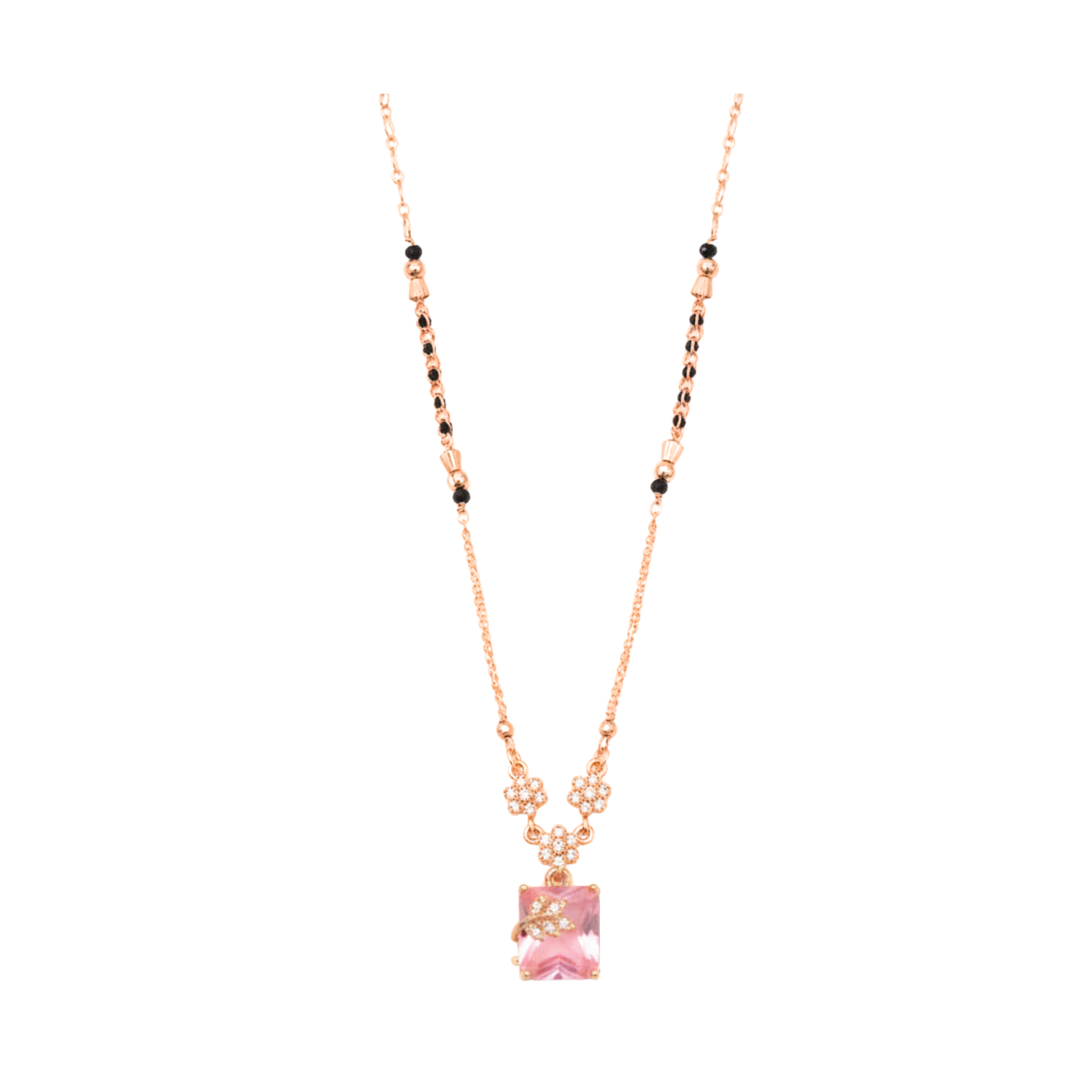 Crafted in 925 sterling silver with a luxurious rose gold finish, the Richa Mangalsutra features a sophisticated pendant delicately strung on the timeless black beaded chain.
