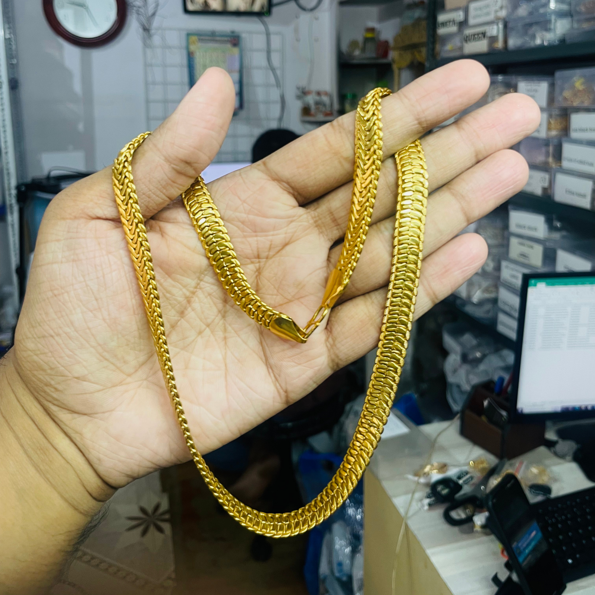 With a bold, asymmetric link structure, the chain features a crown-inspired silhouette with a rugged edge. Crafted in durable Brass with premium micro Gold Plating, it blends raw masculinity with regal flair — making it perfect for those who wear their identity like a crown.