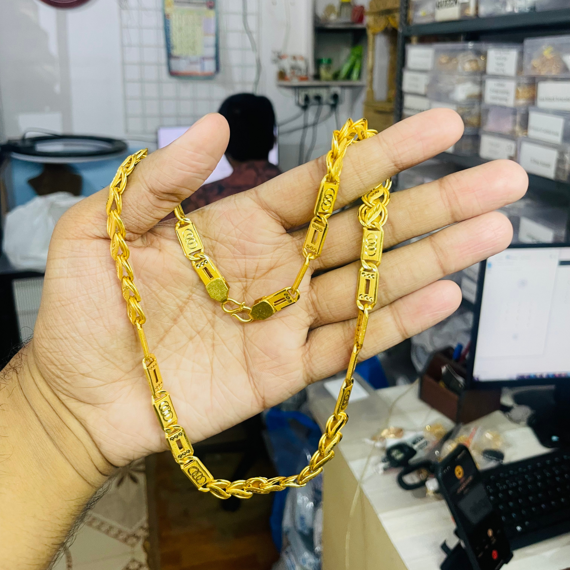 This chain features a sleek, dark-toned gold finish with sharp-cut links that reflect light subtly, creating a refined, almost shadow-like sheen. Crafted in high-quality Brass with micro Gold Plating, it's the perfect blend of bold and minimal.