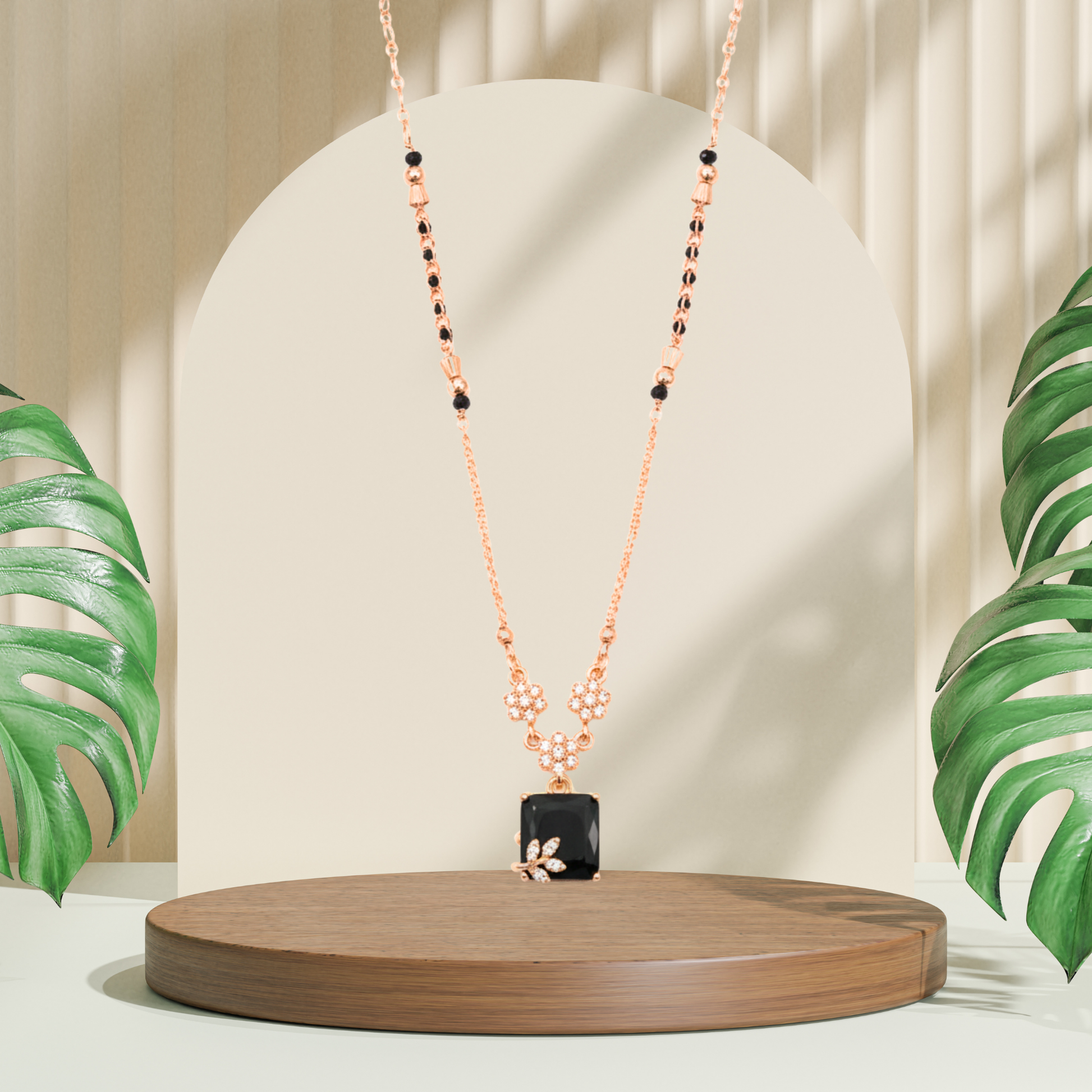 Crafted in 925 sterling silver with a radiant rose gold finish, the Shalini Mangalsutra showcases a delicate yet striking pendant on the classic black beaded chain.