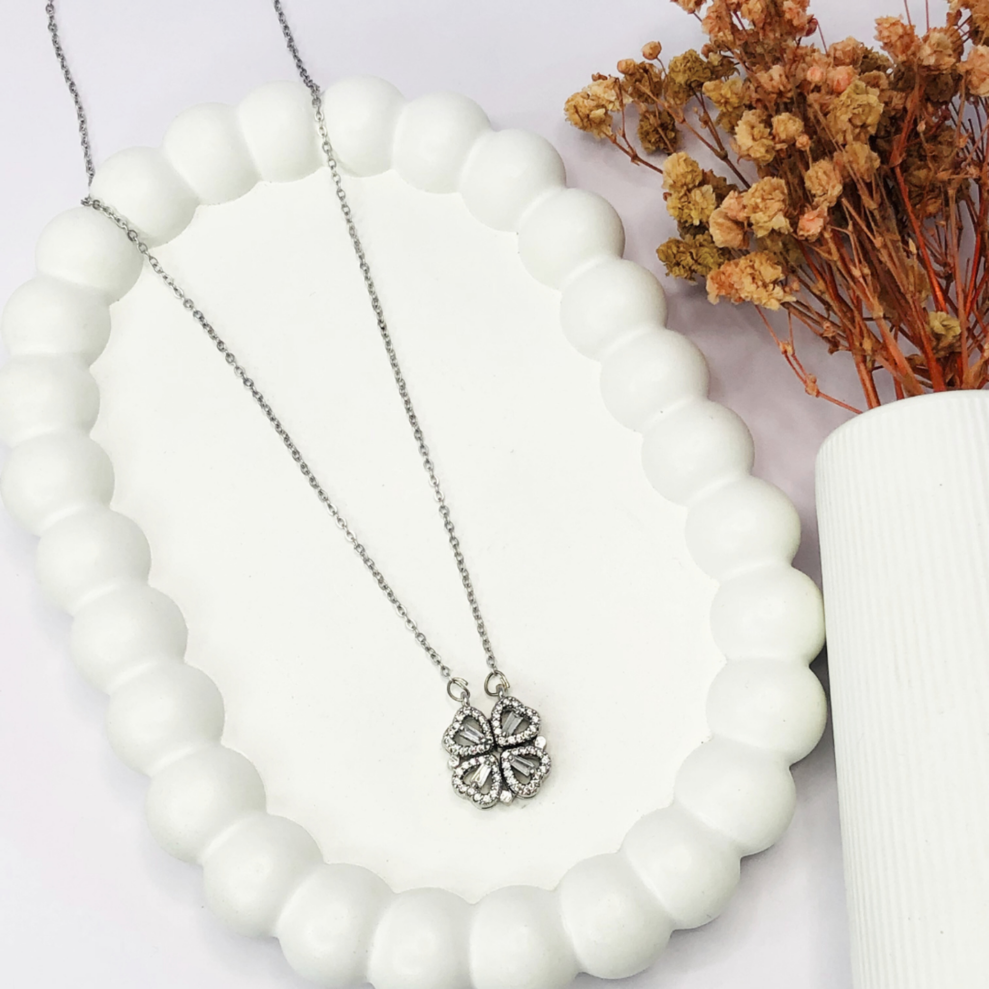 Crafted in high-quality silver plating, this necklace features a beautifully detailed four-leaf clover shaped into a heart, polished to a radiant shine.