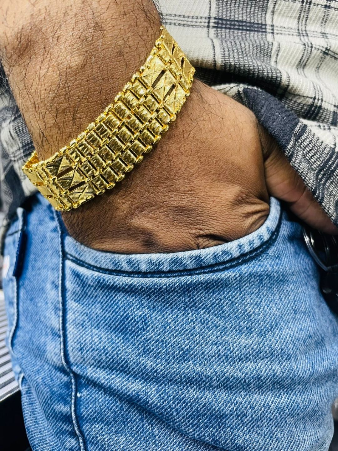 Crafted with a micro gold plated finish, this bracelet features a chunky masculine chain design, radiating power and polish. The structured links are bold yet elegant — a perfect reflection of inner valor wrapped in outer shine.