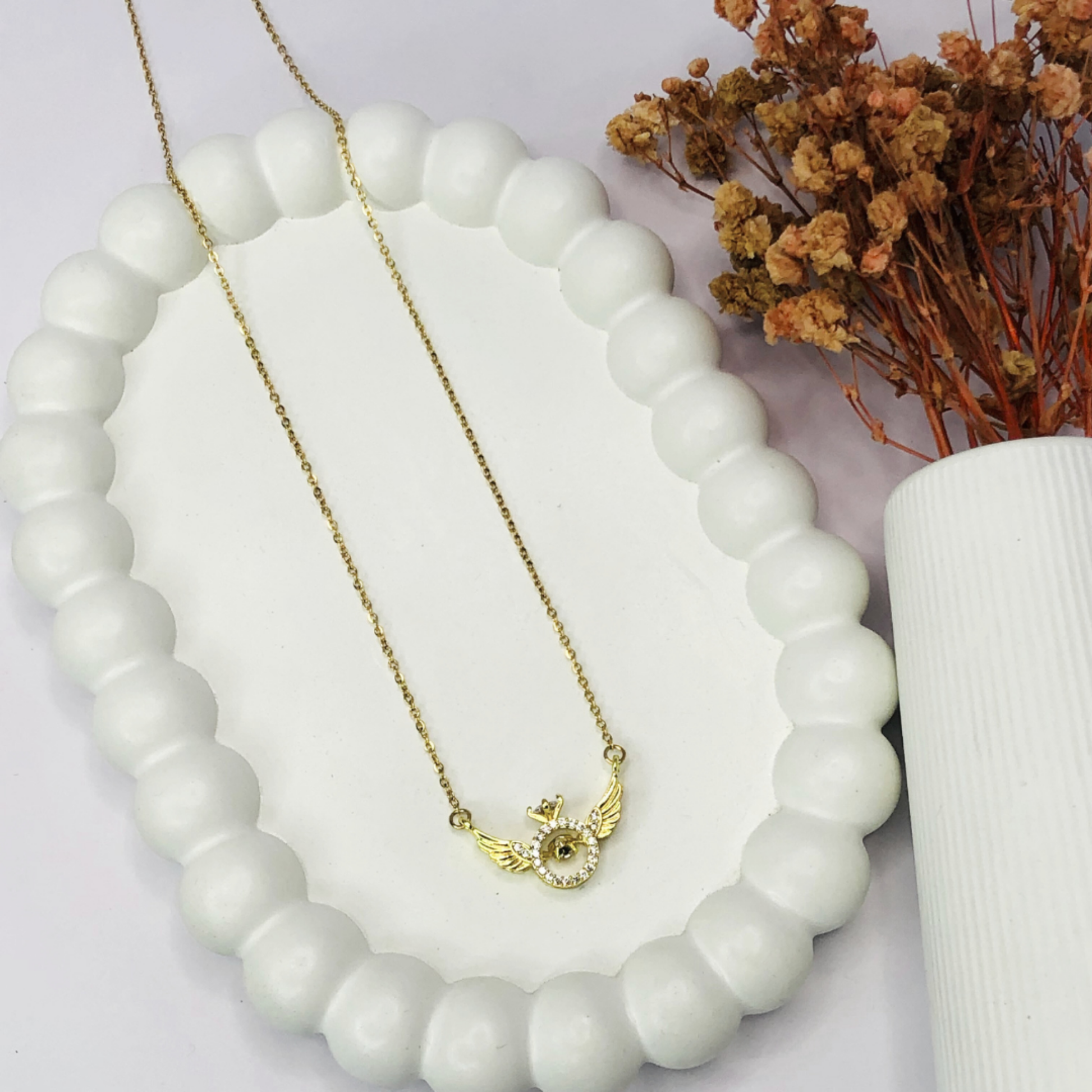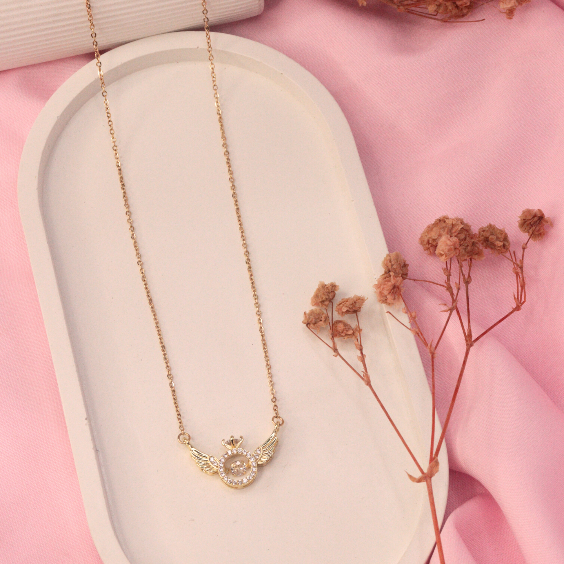 Gracefully crafted and plated in rich 18K gold, the necklace showcases a flying bird motif, accentuated with radiant AAA+ American Diamonds.